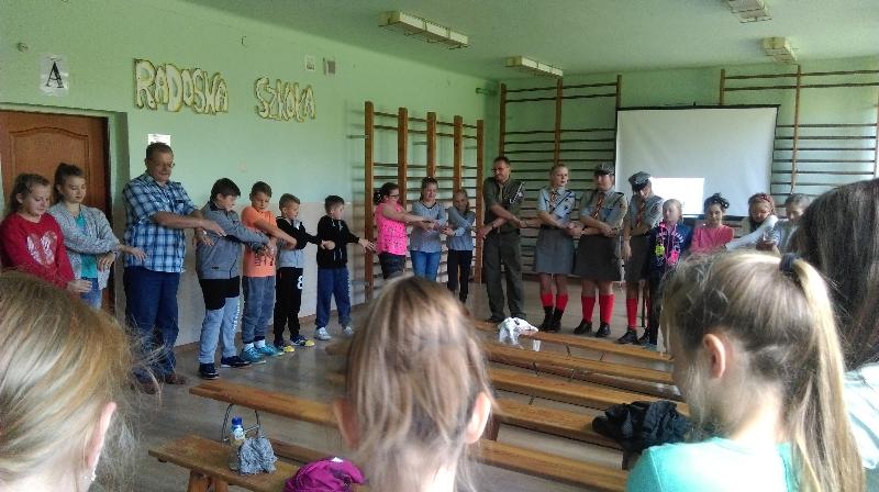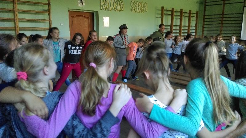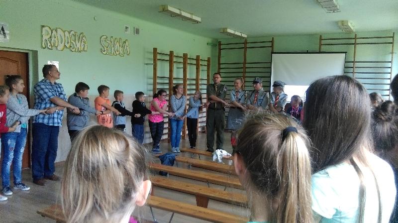 27 września br. gościli w naszej szkole harcerze z siedleckiego hufca Związku Harcerstwa Polskiego wraz ze swoim komendantem dh Zygmuntem Kondraciukiem. W ramach tego spotkania druhny i druh zapoznali uczniów z ideą ruchu harcerskiego. Uczniowie z zainteresowaniem słuchali prezentacji o działalności Hufca ZHP, zadawali liczne pytania i oglądali stroje harcerskie. Jak to u harcerzy bywa nie mogło w trakcie spotkania zabraknąć ciekawych zabaw i pląsów. Nasi uczniowie zostali "zarażeni" ideą harcerstwa i wyrazili chęć organizacji drużyny harcerskiej w naszej szkole. Kandydatom na harcerzy przedstawiono kilka podstawowych zasad, celów oraz metod działania ZHP. Chętnych jest wielu, a pierwsza zbiórka już wkrótce.