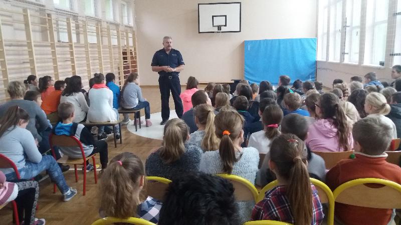 Pan Stefaniak omówił ponadto zagadnienia związane z cyberprzemocy. To zjawisko coraz częściej dotyka prawie wszystkich młodych użytkowników Internetu. Przybliżył również zagadnienia związane z postępowaniem w sprawach nieletnich oraz jak przeciwdziałać narkomanii. Uczniowie mieli okazję zapoznać się z rodzajami środków opiekuńczo - wychowawczych stosowanych przez Sądy Rodzinne wobec nieletnich. Pan policjant zasygnalizował również rodzaje czynów karalnych i konsekwencje jakie mogą spotkać dzieci i młodzież dopuszczających się tych czynów.