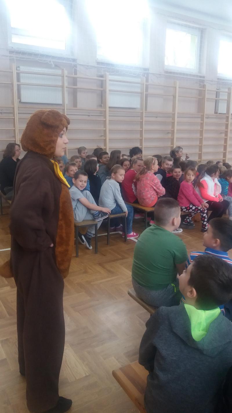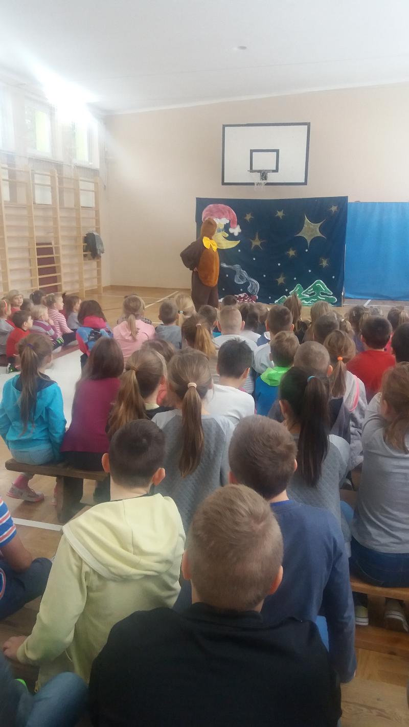30 listopada uczniowie klas 0-IV o godz. 10.15 obejrzeli w szkole bajkę profilaktyczną o zasadach bezpieczeństwa w wykonaniu artystów krakowskiego Teatru Edukacji i Profilaktyki pt.”Miś jest grzeczny i bezpieczny”.