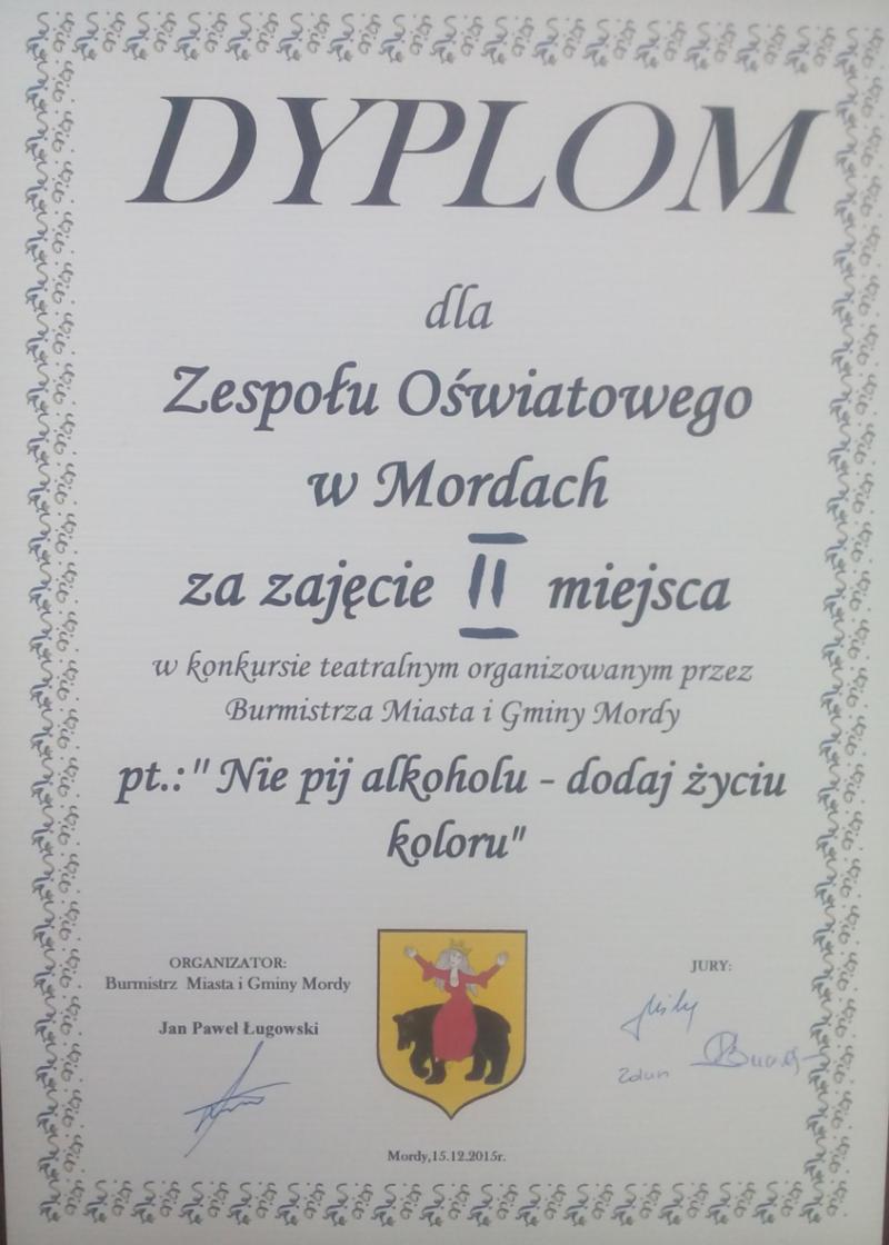 14 grudnia 2015 roku w Miejsko-Gminnym Ośrodku Kultury w Mordach odbył się przegląd teatrzyków szkolnych w ramach konkursu ogłoszonego przez Burmistrza Miasta i Gminy Mordy pt. „NIE PIJ ALKOHOLU - DODAJ ŻYCIU KOLORU". W przeglądzie uczestniczyły teatrzyki z: Gimnazjum nr 1 w Mordach, Zespołu Szkół w Radzikowie Wielkim i Zespołu Oświatowego w Mordach. Teatrzyk uczniów klasy VI a z naszej szkoły został uznany przez komisję konkursową za drugi teatrzyk przeglądu.