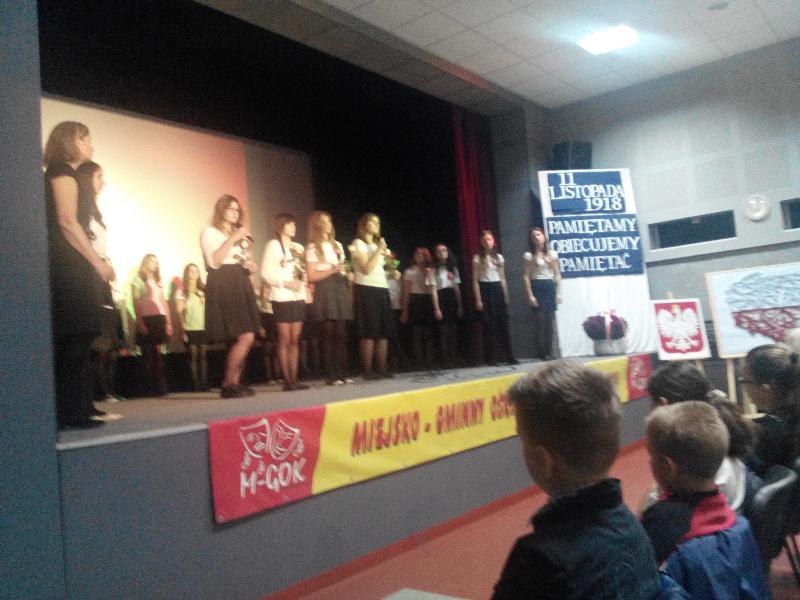 Nasi starsi koledzy, byli uczniowie szkoły, przypomnieli nam dni 123 lat niewoli Polski, począwszy od dnia kiedy Polska jako niepodległe państwo przestało istnieć na mapie Europy. Z wielką uwagą obejrzeliśmy prezentację historyczną o trzech wielkich Polakach: Józefie Piłsudskim, Romanie Dmowskim i Ignacym Paderewskim przygotowaną przez Marcina Zdanowskiego. Przekazywane treści były przeplatane patriotycznymi pieśniami w wykonaniu chóru pod dyrekcją p. Małgorzaty Pasterskiej oraz recytacjami wierszy przygotowanych pod kierunkiem p. Krystyny Kaniewskiej-Pietrasik.