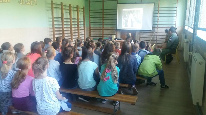 Pan Stefaniak omówił ponadto zagadnienia związane z cyberprzemocy. To zjawisko coraz częściej dotyka prawie wszystkich młodych użytkowników Internetu. Przybliżył również zagadnienia związane z postępowaniem w sprawach nieletnich oraz jak przeciwdziałać narkomanii. Uczniowie mieli okazję zapoznać się z rodzajami środków opiekuńczo - wychowawczych stosowanych przez Sądy Rodzinne wobec nieletnich. Pan policjant zasygnalizował również rodzaje czynów karalnych i konsekwencje jakie mogą spotkać dzieci i młodzież dopuszczających się tych czynów.