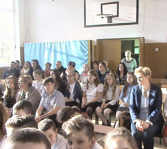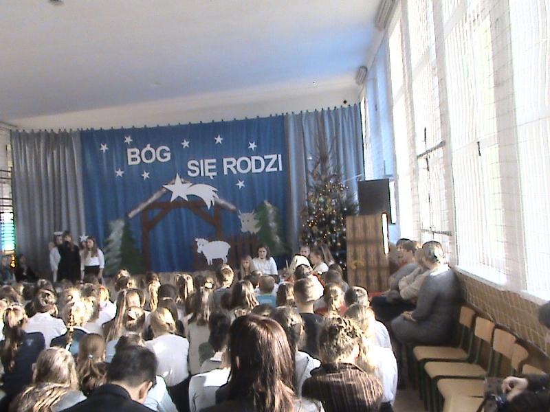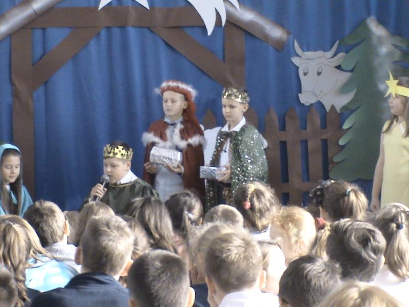 Po zakończeniu występu życzenia świąteczne uczniom, rodzicom i pracownikom szkoły złożyli: dyrektor szkoły p. Teresa Kozos, burmistrz Jan Ługowski i ksiądz proboszcz Karol Klewek.