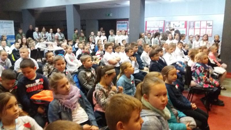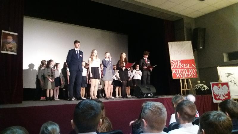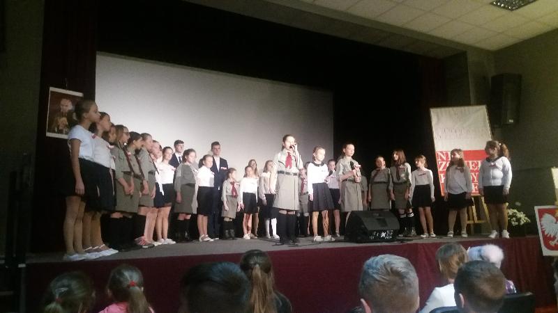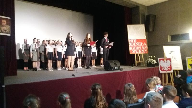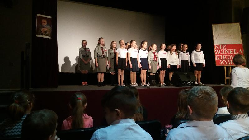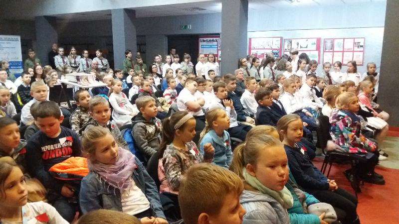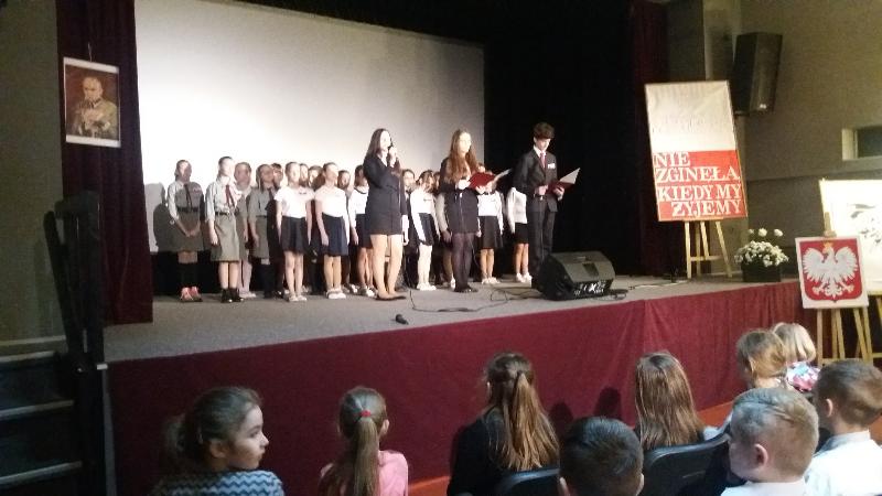 Dnia 10 listopada 2017 r. uczniowie szkoły podstawowej wzięli udział w uroczystej akademii, która odbyła się w Miejsko-Gminnym Ośrodku Kultury. Najpierw do MGOK przybyli uczniowie klas III-V a po nich inscenizację patriotyczną obejrzeli starsi uczniowie. Na tę część uroczystości przybyli również zaproszeni goście: burmistrz Jan Ługowski, przewodnicząca Rady Miejskiej Ewa Jarocka, sekretarz UMiG Mirosław Łukowski, kierownik Referatu Organizacyjno-Administracyjnego Monika Nasiłowska-Osik, przewodnicząca Rady Rodziców Magdalena Dołęga.