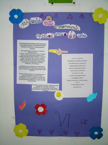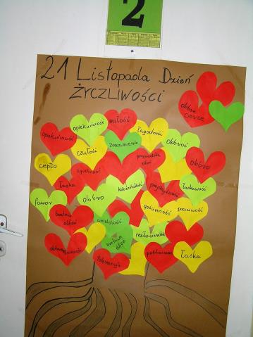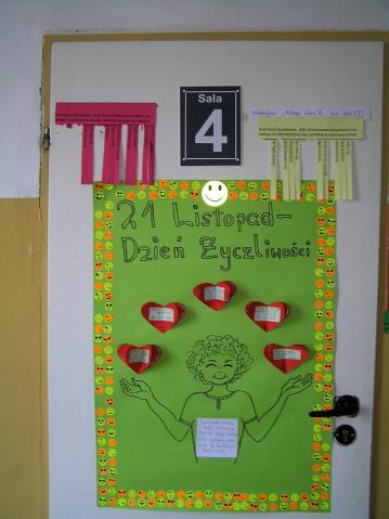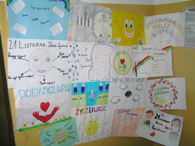 Dnia 21 listopada br. obchodzony był w budynku B "Dzień Życzliwości". Każda klasa wykonała plakat, który był apelem przeciwko szarej i smutnej rzeczywistości. Na korytarzu natomiast umieszczona została specjalna skrzynka zawierająca życzliwe wyzwania do wykonania przez uczniów. Prace oceniła komisja w składzie: Pan Andrzej Michałowski, Pani Edyta Iwańczuk, Pani Agnieszka Konaszuk i Konrad Kamiński. Końcowe wyniki konkursu na plakat przedstawiają się następująco: