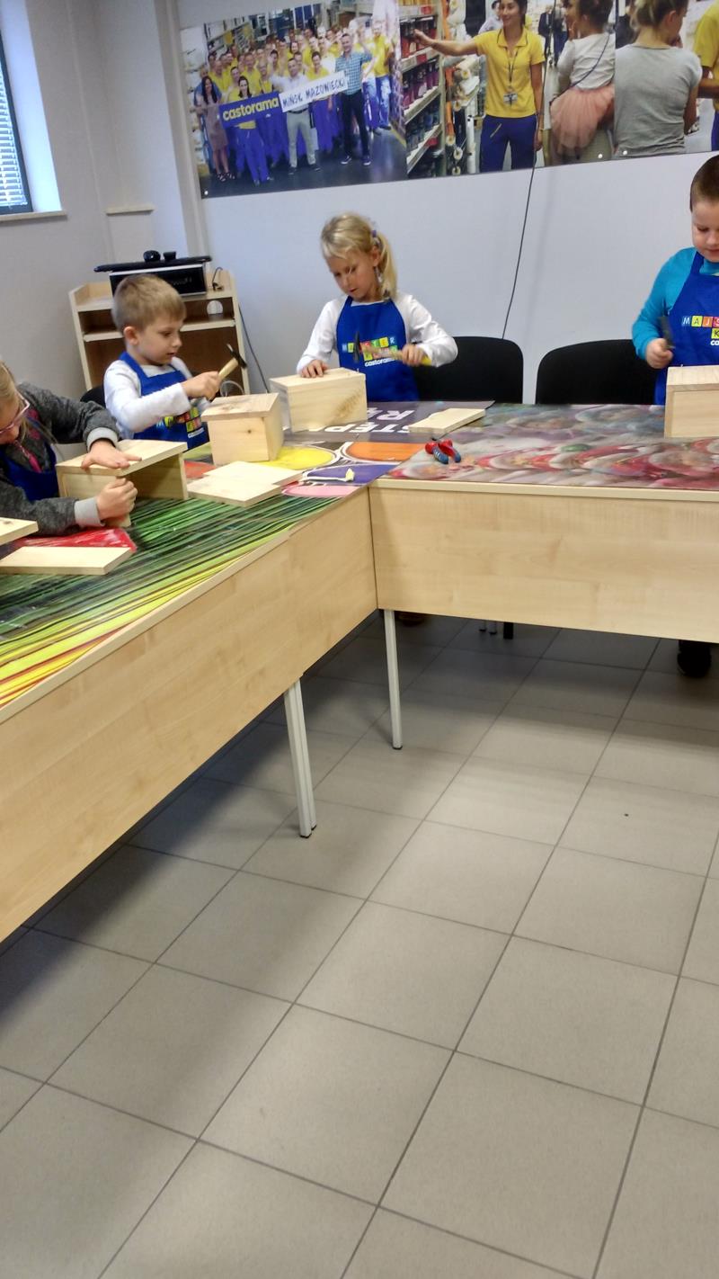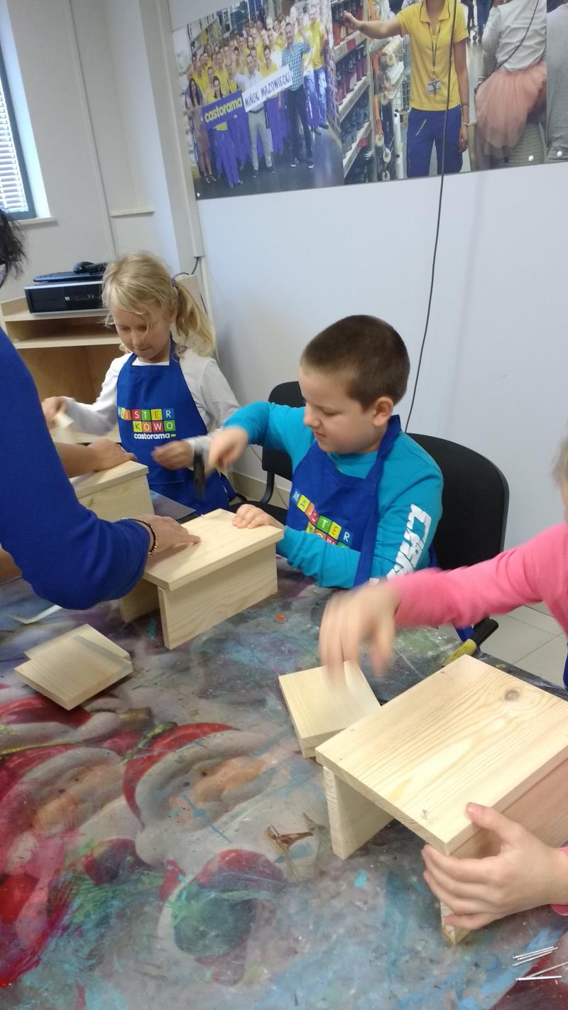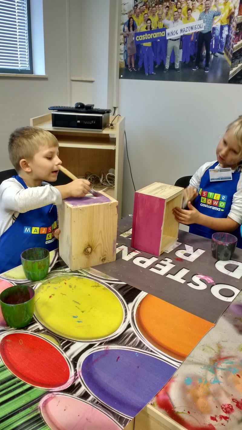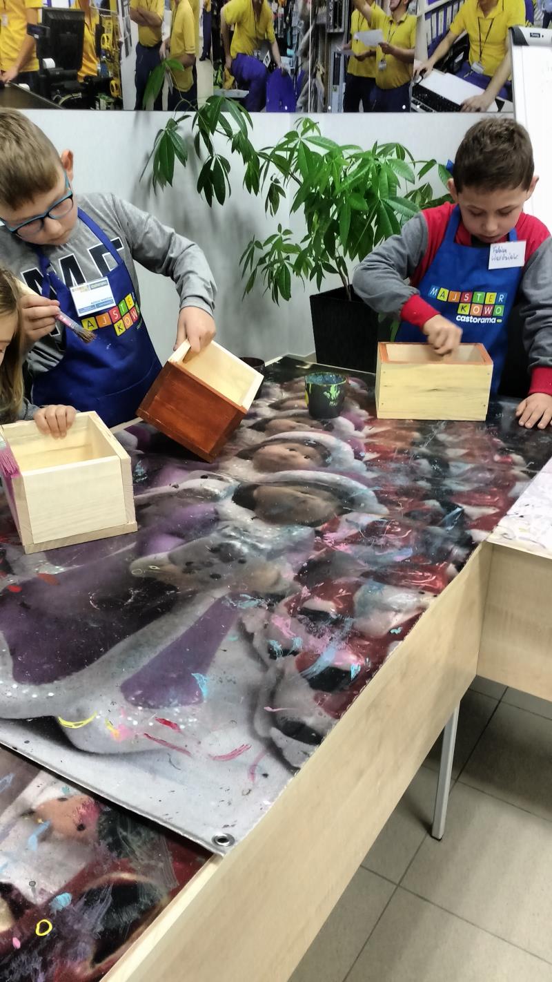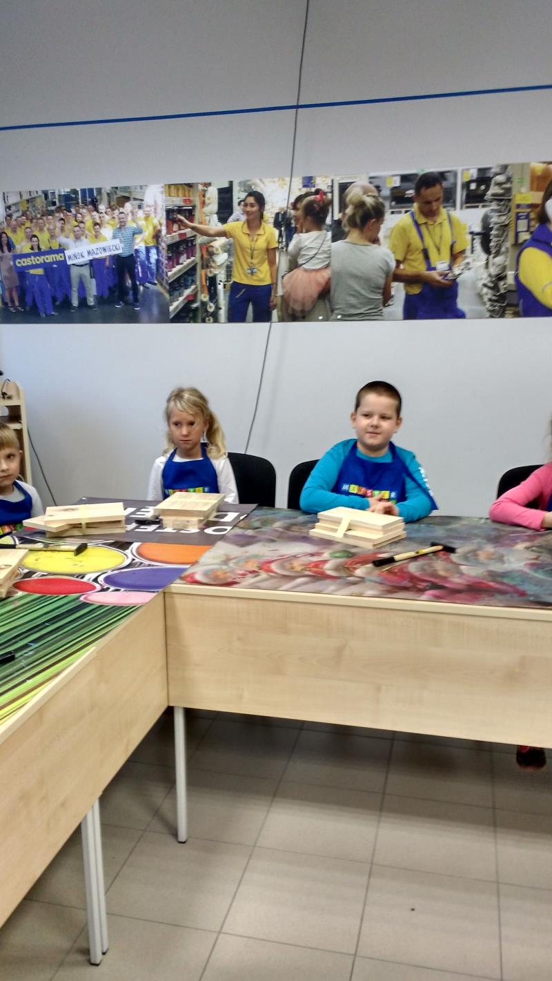 W środę 18 października uczniowie klasy II i IIIa pod opieką p. Agaty Kesling, p. Renaty Teodorczuk i p. Anety Ilczuk uczestniczyli w warsztatach „Majsterkowo” organizowanych przez Castoramę w Mińsku Mazowieckim. Głównym celem było rozbudzanie w dzieciach pasji do majsterkowania, pobudzanie wyobraźni, rozwijanie umiejętności manualnych, a także zwiększanie wiedzy i świadomości ekologicznej. Podczas zajęć poświęconych tematyce drewna, dzieci dowiedziały się, jak wygląda proces przetwarzania od momentu posadzenia drzewa, aż do sprzedaży drewnianej deski w sklepie. Z pomocą wykwalifikowanych pracowników Castoramy, uczniowie montowali „pudełka na skarby”. Najpierw w ruch poszły młotki i gwoździe. Dzieci samodzielnie zbijały i łączyły drewniane elementy. Kolejnym etapem było malowanie farbami akrylowymi i ozdabianie. Wszyscy swoje prace wykonali bardzo starannie.