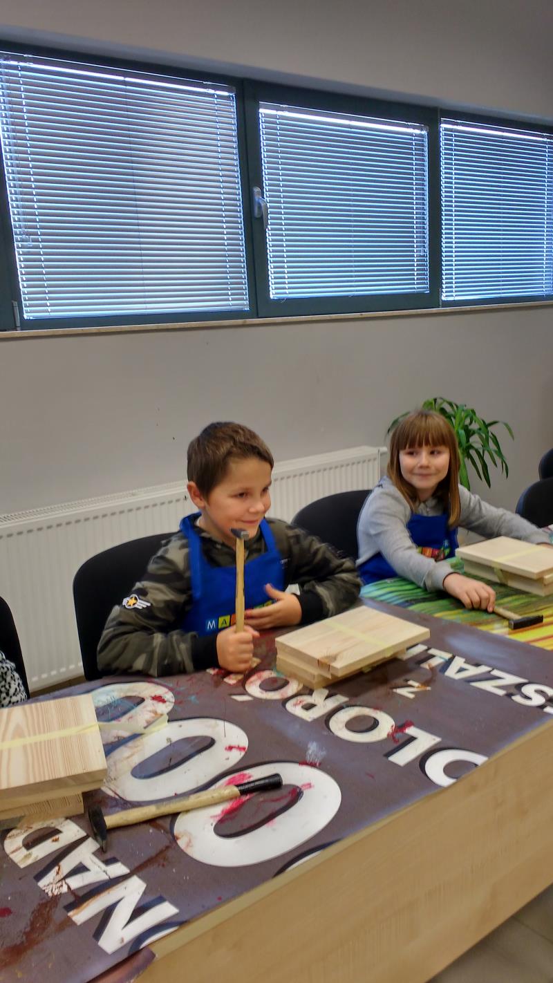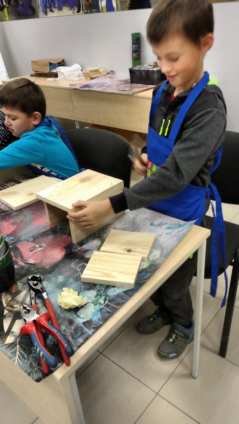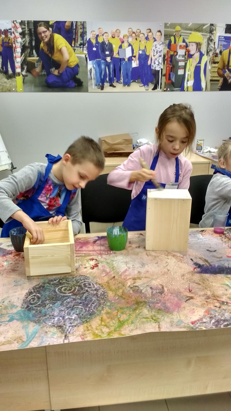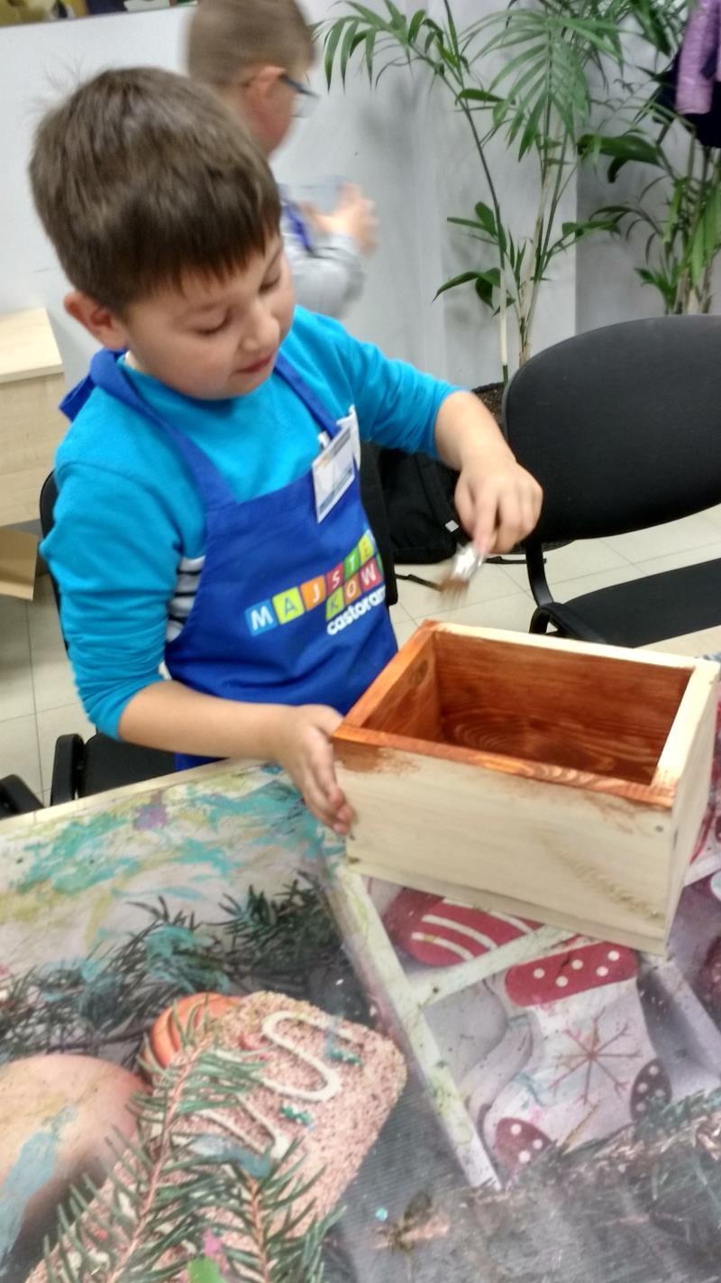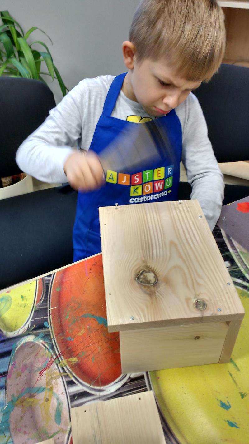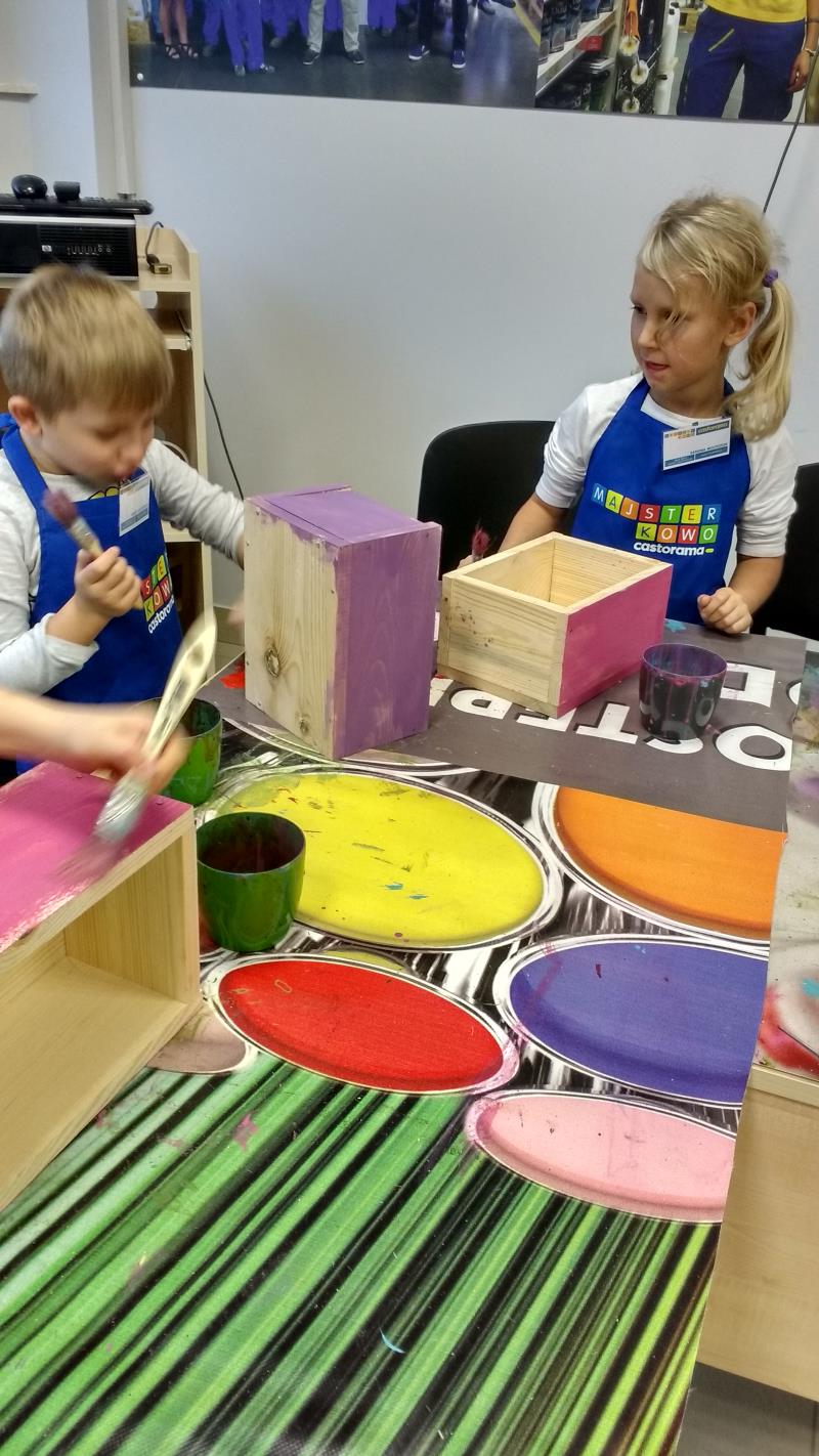W środę 18 października uczniowie klasy II i IIIa pod opieką p. Agaty Kesling, p. Renaty Teodorczuk i p. Anety Ilczuk uczestniczyli w warsztatach „Majsterkowo” organizowanych przez Castoramę w Mińsku Mazowieckim. Głównym celem było rozbudzanie w dzieciach pasji do majsterkowania, pobudzanie wyobraźni, rozwijanie umiejętności manualnych, a także zwiększanie wiedzy i świadomości ekologicznej. Podczas zajęć poświęconych tematyce drewna, dzieci dowiedziały się, jak wygląda proces przetwarzania od momentu posadzenia drzewa, aż do sprzedaży drewnianej deski w sklepie. Z pomocą wykwalifikowanych pracowników Castoramy, uczniowie montowali „pudełka na skarby”. Najpierw w ruch poszły młotki i gwoździe. Dzieci samodzielnie zbijały i łączyły drewniane elementy. Kolejnym etapem było malowanie farbami akrylowymi i ozdabianie. Wszyscy swoje prace wykonali bardzo starannie.