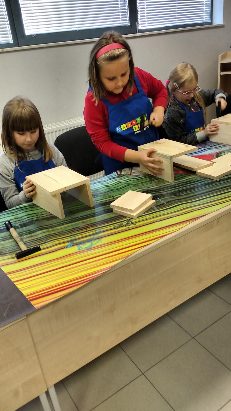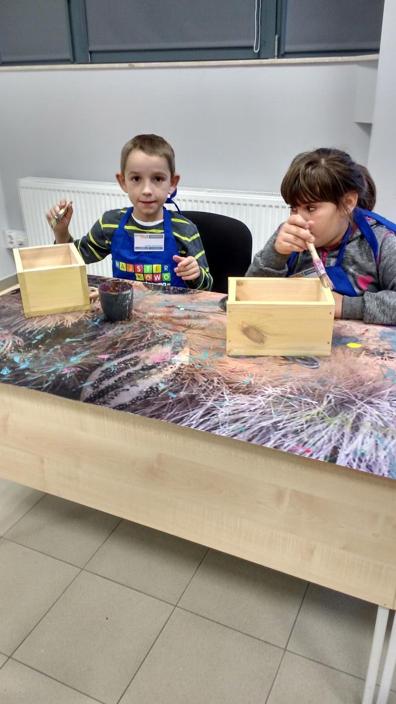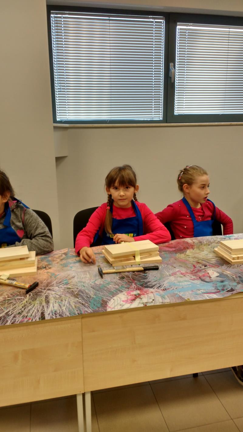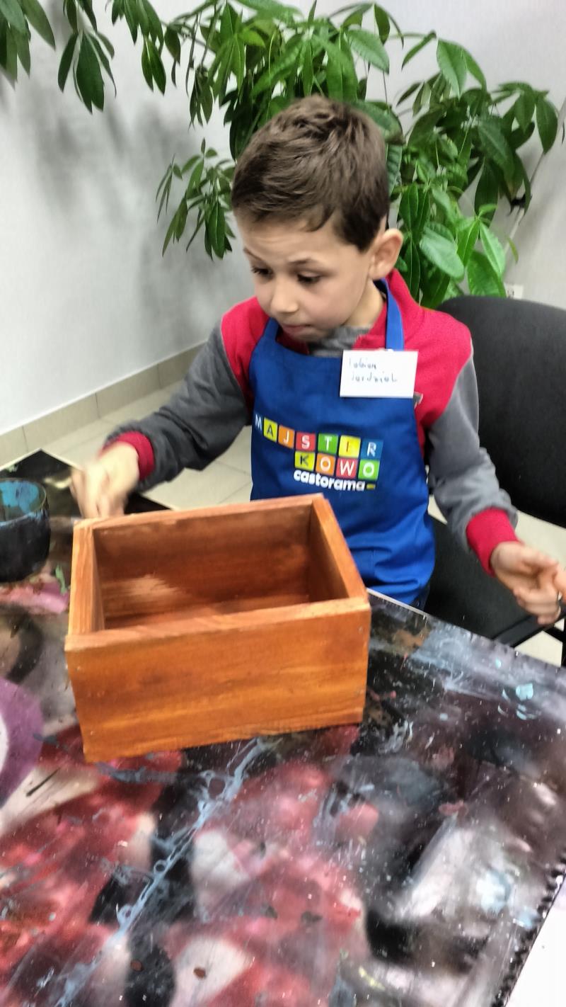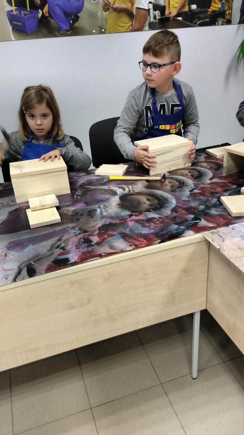 W środę 18 października uczniowie klasy II i IIIa pod opieką p. Agaty Kesling, p. Renaty Teodorczuk i p. Anety Ilczuk uczestniczyli w warsztatach „Majsterkowo” organizowanych przez Castoramę w Mińsku Mazowieckim. Głównym celem było rozbudzanie w dzieciach pasji do majsterkowania, pobudzanie wyobraźni, rozwijanie umiejętności manualnych, a także zwiększanie wiedzy i świadomości ekologicznej. Podczas zajęć poświęconych tematyce drewna, dzieci dowiedziały się, jak wygląda proces przetwarzania od momentu posadzenia drzewa, aż do sprzedaży drewnianej deski w sklepie. Z pomocą wykwalifikowanych pracowników Castoramy, uczniowie montowali „pudełka na skarby”. Najpierw w ruch poszły młotki i gwoździe. Dzieci samodzielnie zbijały i łączyły drewniane elementy. Kolejnym etapem było malowanie farbami akrylowymi i ozdabianie. Wszyscy swoje prace wykonali bardzo starannie.