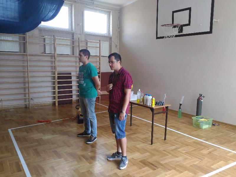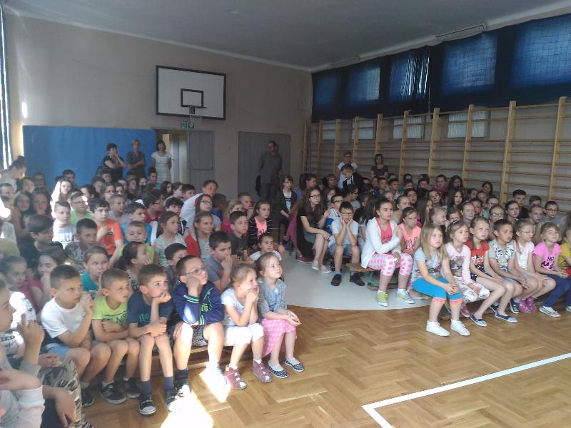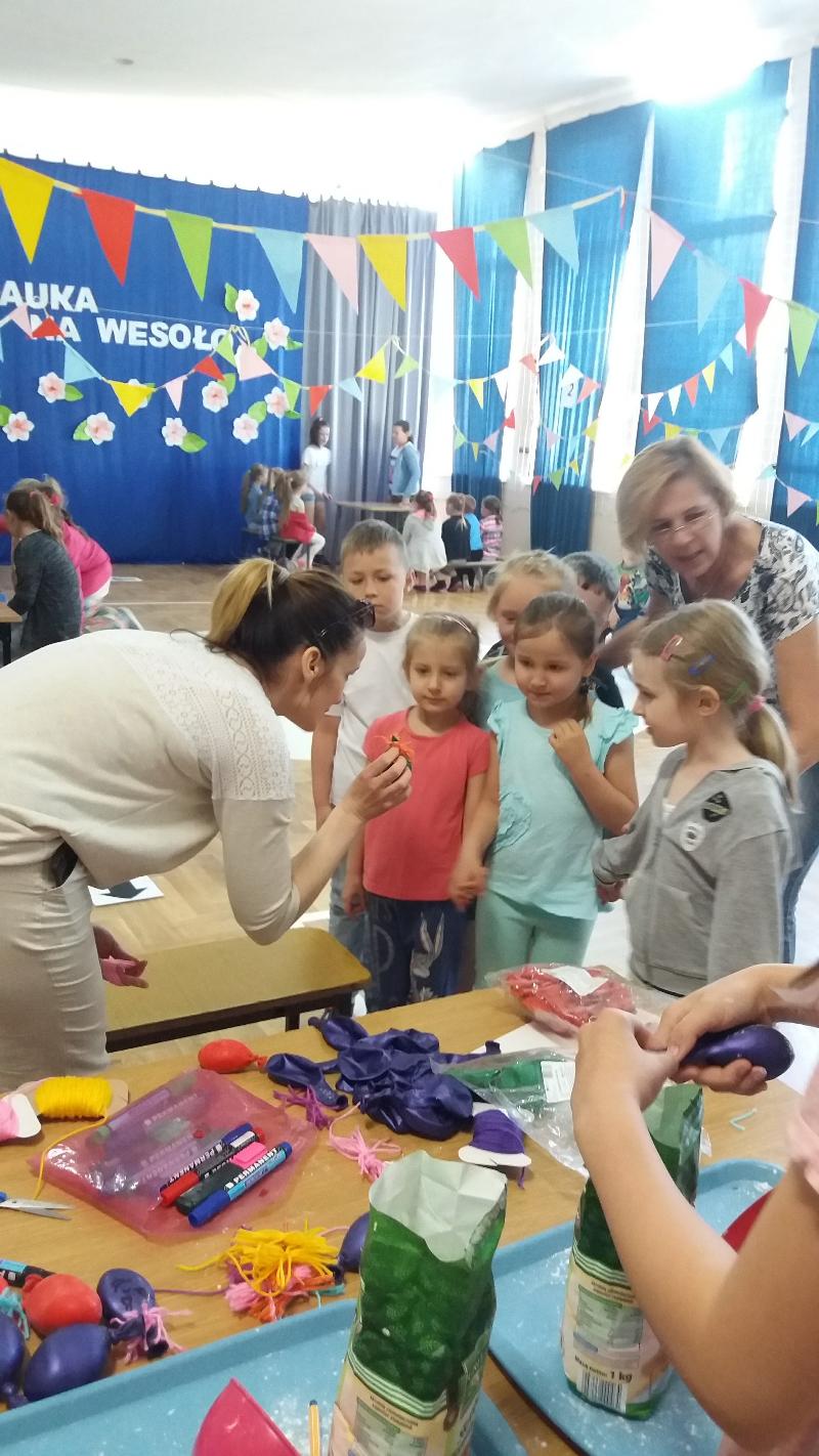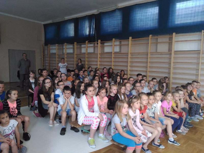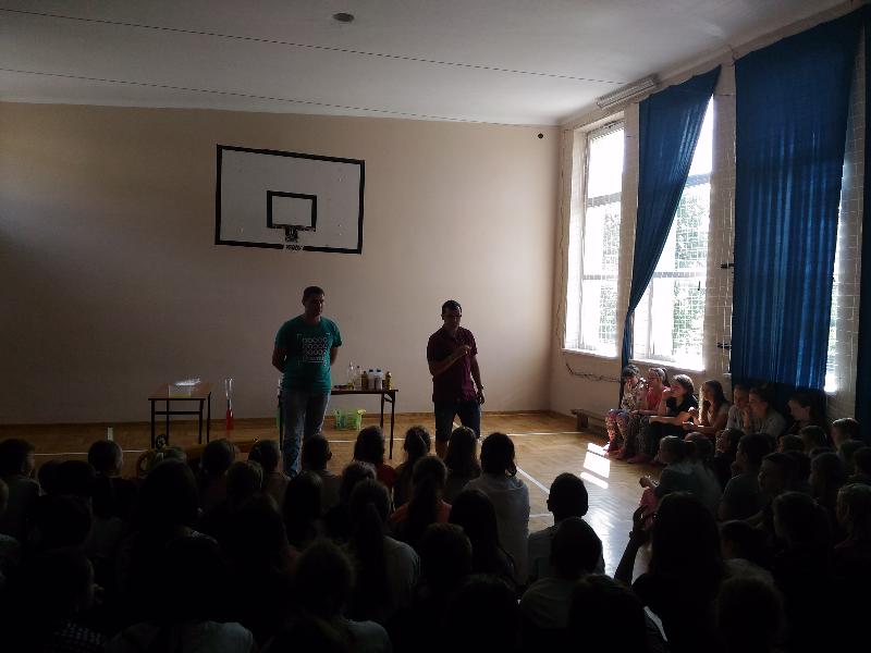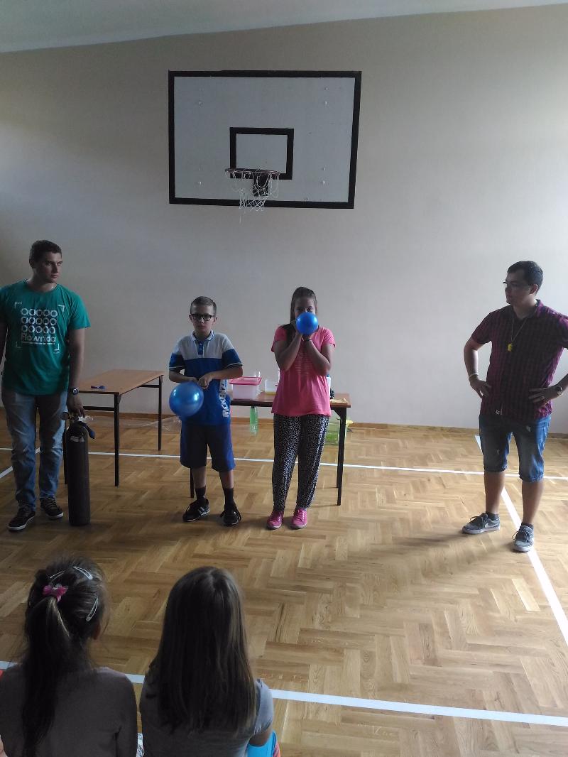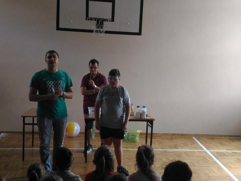 Dnia 30 maja odwiedziła nas grupa "Zaelektryzowani" zaproszona przez panią Małgosię Pawłowski. Przyjechali z Lublina. Była to niecodzienna lekcja przyrody pt. "Naukowa epidemia, czary mary i alchemia". O godzinie 9:50 zebraliśmy się w sali gimnastycznej, gdzięki czekało na nas dwoje studentów. W żywej lekcji przyrody uczestniczyły klasy IV-VI i klasy II. Było bardzo zabawnie. Kilka osób mogło nawet uczestniczyć w różnych doświadczeniach. To widowisko bardzo się wszystkim podobało. Sprawdzaliśmy jak szybciej nadmuchać rękaw do pieczenia, dwie osoby wdychały hel. Jednej dziewczynie podpalono na ręce propan butan. Potem do balona pan wpuścił specjalny gaz i podpalił go. Pojawiła się chwilowa kula ognia. Takich doświadczeń było więcej. Wszyscy wyszli z tamtąd w bardzo dobrych humorach. To była naprawdę ciekawa lekcja przyrody.