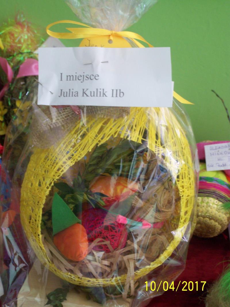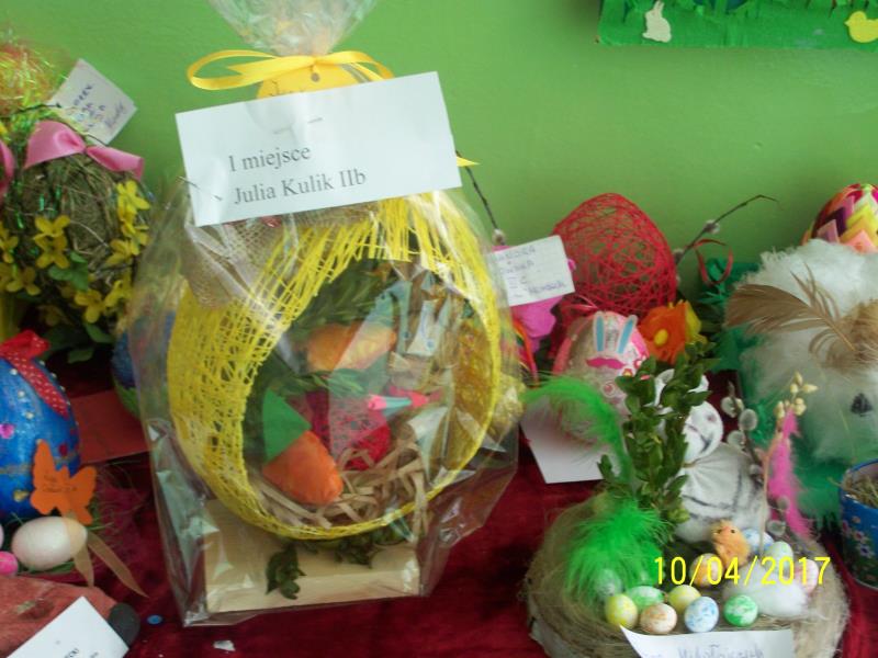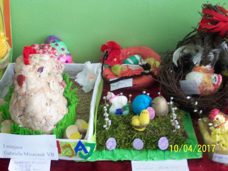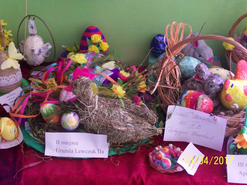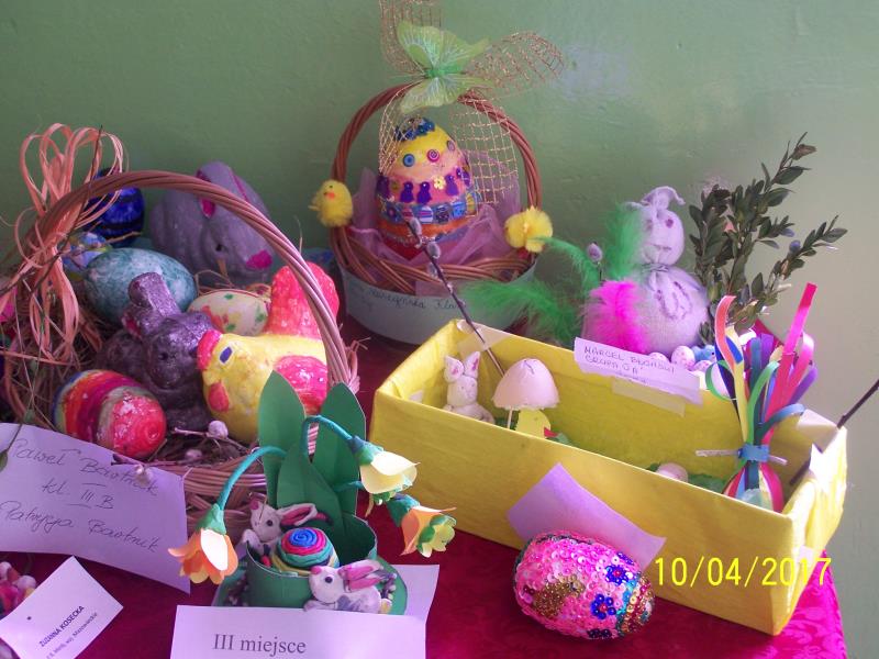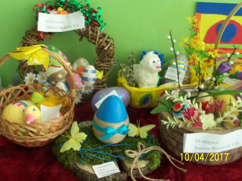 Na coroczny konkurs "Wielkanocna pisanka", do etapu szkolnego, zgłoszono 54 prace w dwóch kategoriach wiekowych : klasy 0-III i klasy IV-VI. Dnia 07 kwietnia br. komisja w składzie: P.Agnieszka Geneja, P.Katarzyna Malińska i P.Elżbieta Żodzik dokonała ich oceny. Laureatami konkursu w naszej szkole zostali: