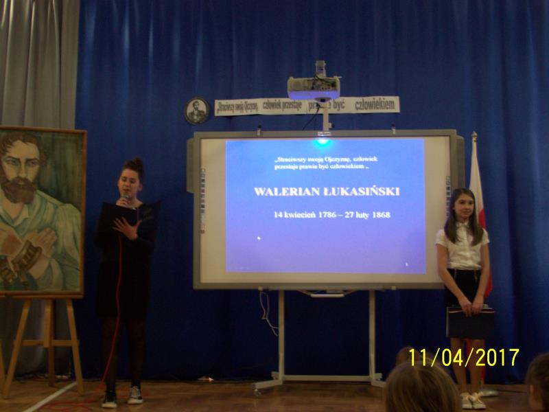 We wtorek, 11 kwietnia, uczciliśmy pamięć naszego Patrona – Waleriana Łukasińskiego z okazji przypadającej w dniu 14 kwietnia 231. rocznicy jego Urodzin. Uczniowie klasy VIA pod opieką p. Jerzego Borowskiego przygotowali uroczystą akademię. Rozpoczęła się ona od odśpiewania hymnu państwowego. Następnie uczniowie obejrzeli wywiad jaki przeprowadziły z Patronem uczennice. Na ich pytania odpowiadał ożywiony portret Łukasińskiego.