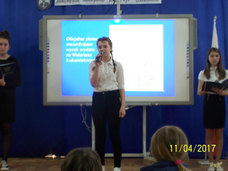 W dalszej części uczniowie przypomnieli najważniejsze fakty z życia Patrona przeplatane wierszami oraz fragmentami filmów fabularnych o Walerianie Łukasińskim: „Księżna Łowicka” z 1932 roku oraz „Tajny więzień stanu” z 1978 roku”. Tłem dla recytacji i pieśni patriotycznych była prezentacja multimedialna o epoce, w której żył i działał nasz Patron.