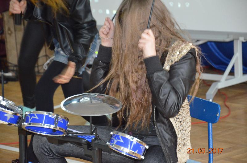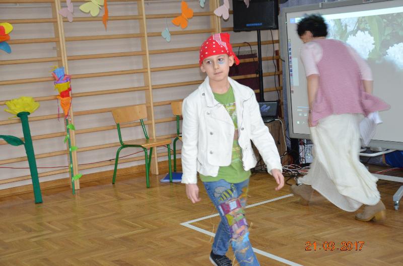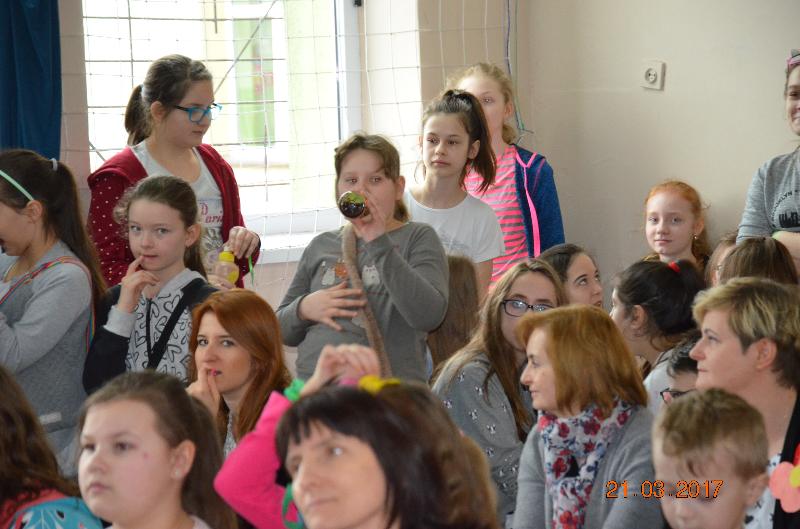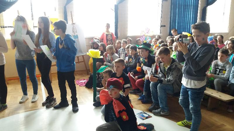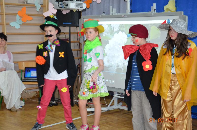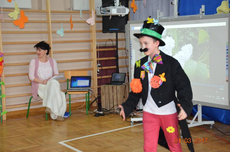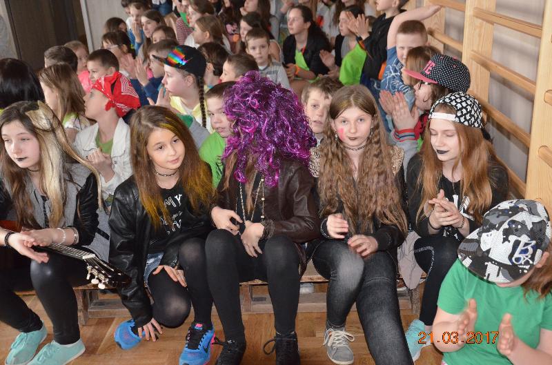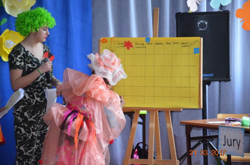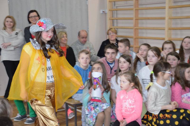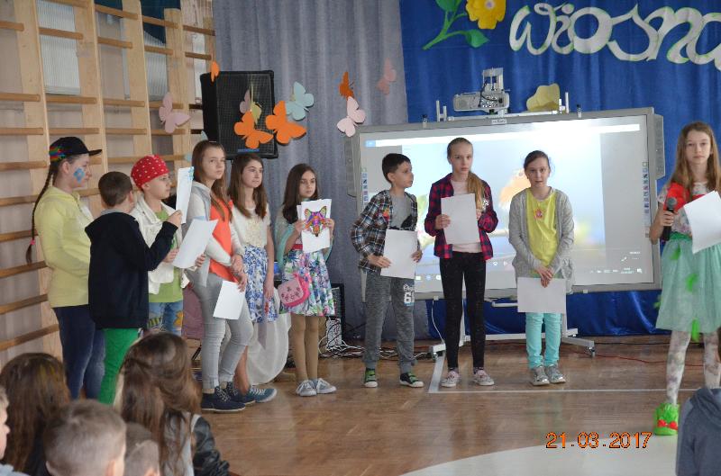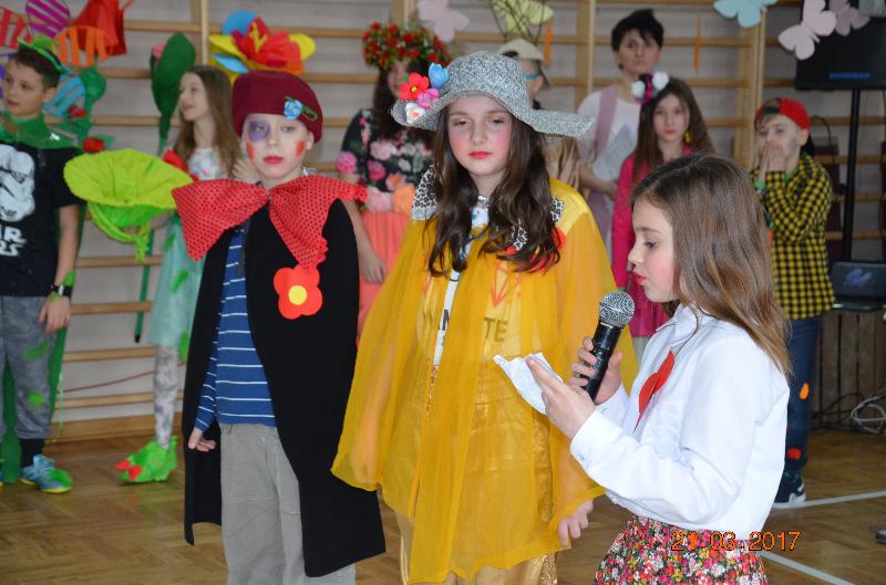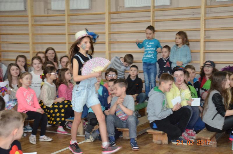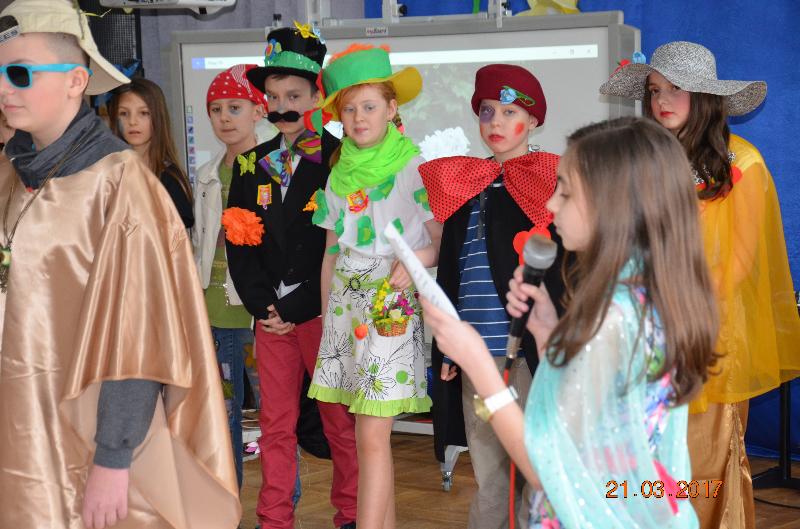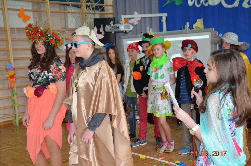 Następnie wyznaczeni uczniowie, przedstawiciele klas zmierzyli się w wiosennym quizie wiedzy. Obejrzeliśmy też niezwykle efektowny pokaz mody damskiej i męskiej „Wiosna 2017”. Zabawne komentarze projektantów uświetniły pokaz, który jak wszystkie pozostałe konkurencje podlegał ocenie jury. Kolejnym zadaniem dla klas była wiosenna dekoracja okien w salach lekcyjnych, a także opracowanie i zaprezentowanie wiosennego akcentu ubioru każdej klasy. Jedną z ostatnich konkurencji było wyrecytowanie napisanych przez uczniów wierszy, oczywiście o tematyce wiosennej. W przerwach między konkurencjami obejrzeliśmy znakomity występ zespołu Lombard – mini playback show zaprezentowały uczennice klasy Va. Uczennice klasy Vb zaśpiewały znaną piosenkę „Chodź pomaluj mój świat”. Wszyscy śpiewali lubiane piosenki karaoke. Ciekawą atrakcją był wybór Mistera szkoły. Po wielu trudach tytuł ten uzyskał uczeń klasy VIb – Kacper Głuchowski.