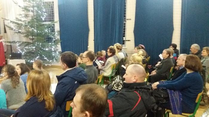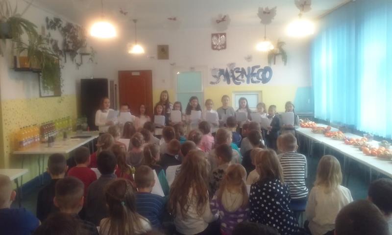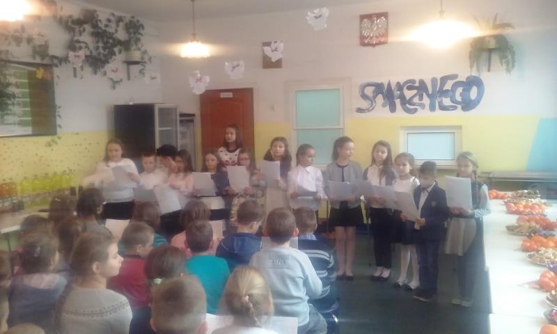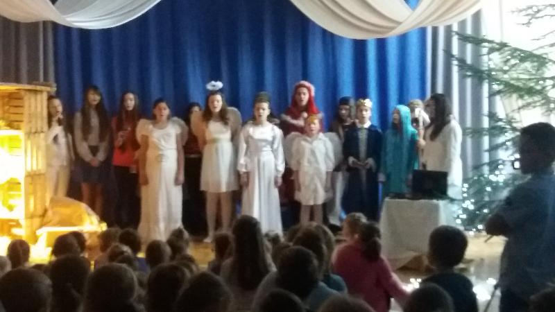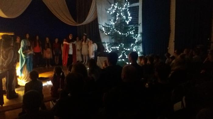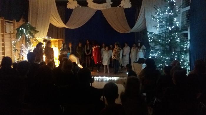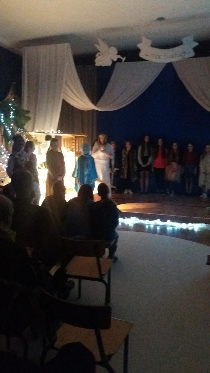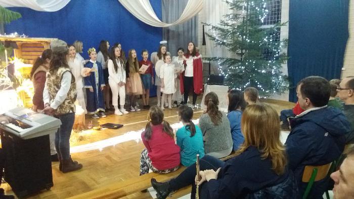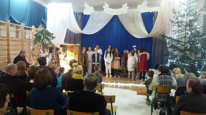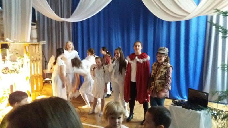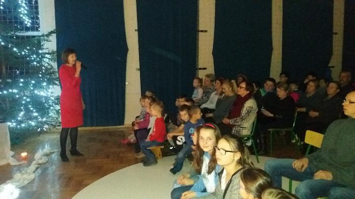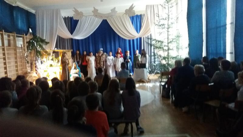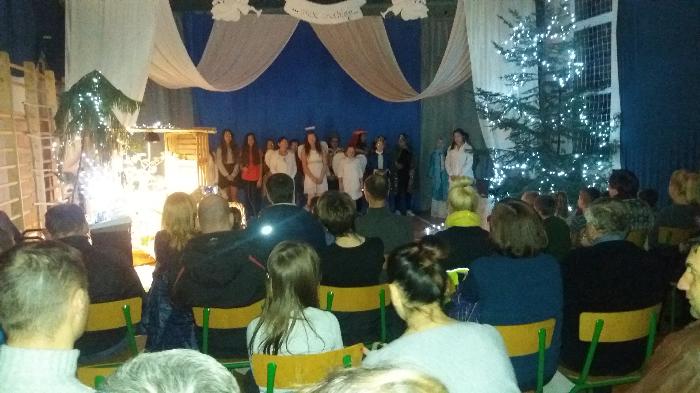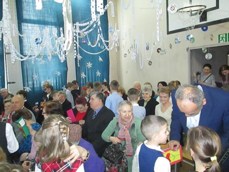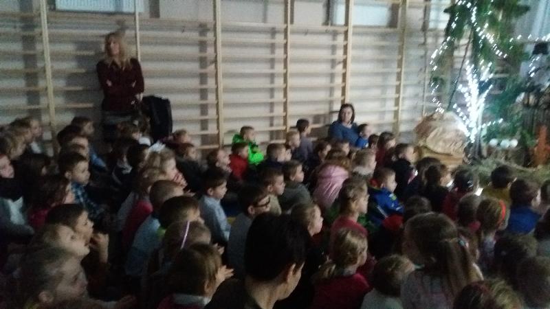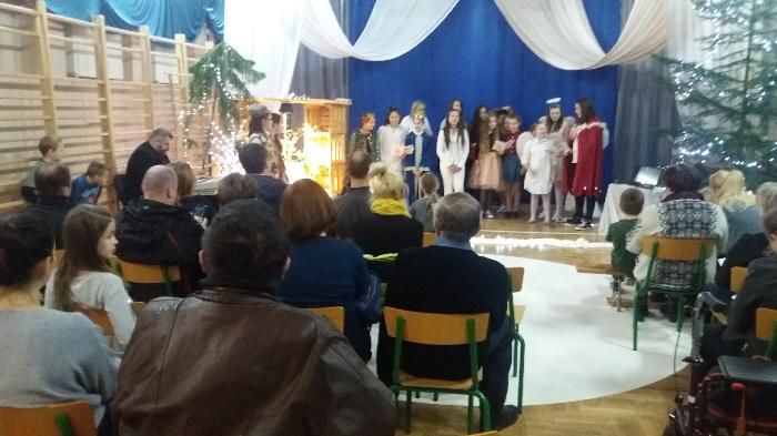 Zebrani w wielkim skupieniu wysłuchali świątecznego przesłania. Po raz kolejny przeżywali historię Maryi i Józefa szukających schronienia na noc. Całość przedstawienia przeplatana była pięknymi kolędami a dwie uczennice klas szóstych: Julia Jastrzębska i Marta Zacharczuk akompaniowały na flecie i skrzypcach. Ogromne zaangażowanie młodych aktorów opłaciło się, gdyż przedstawienie wywarło duże wrażenie i poruszenie. Uczniowie mieli natomiast okazję zaprezentować swoim rodzicom i dziadkom zaprezentowania swoich umiejętności artystycznych.