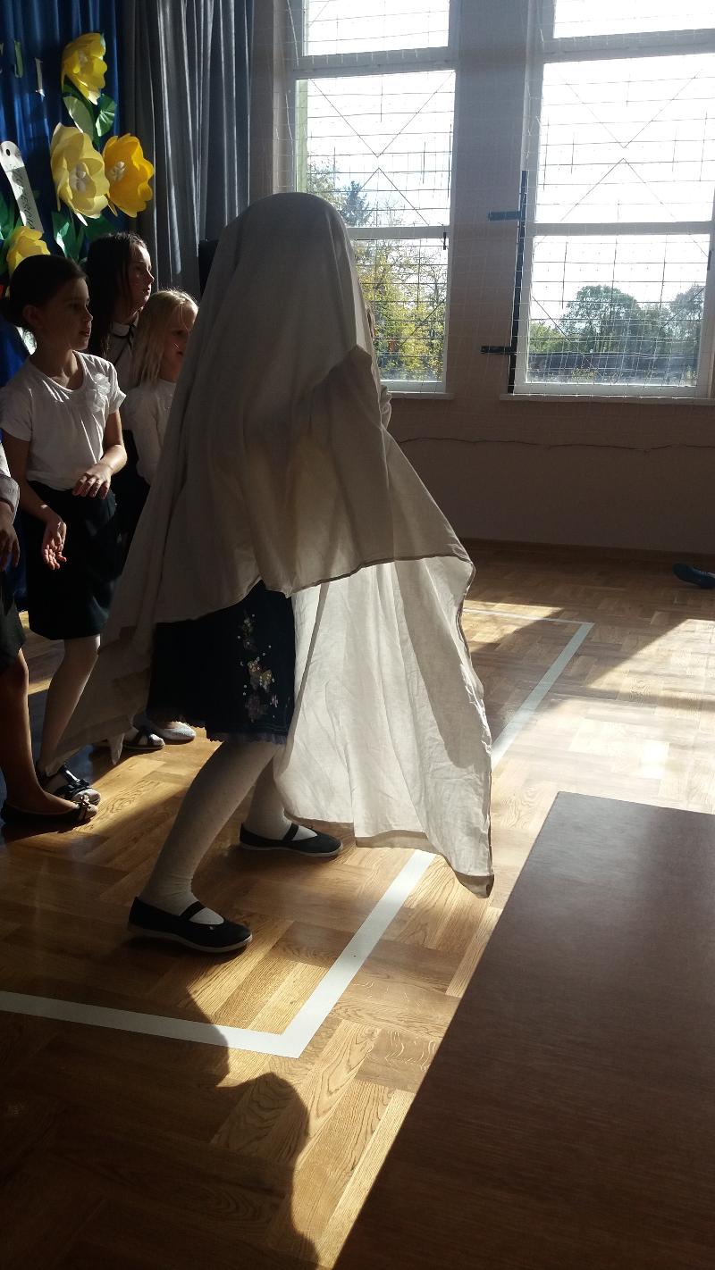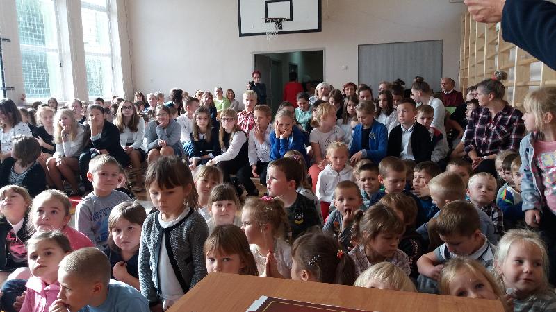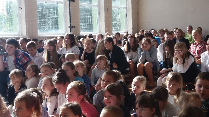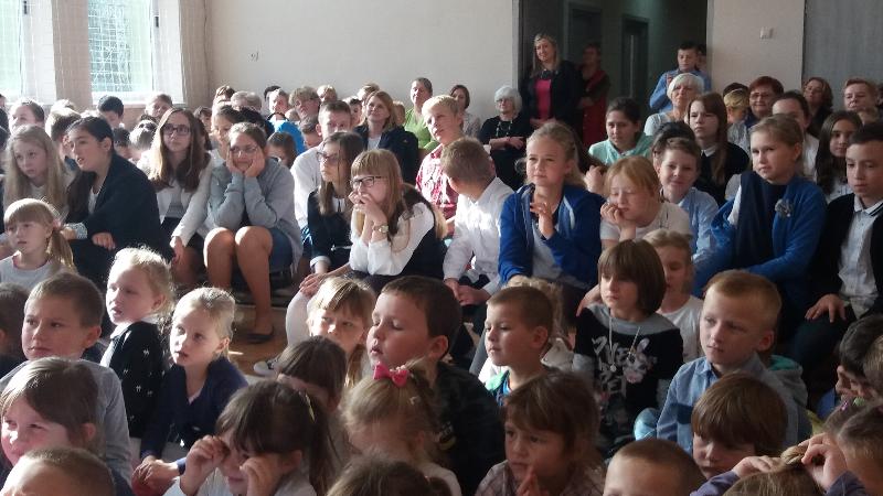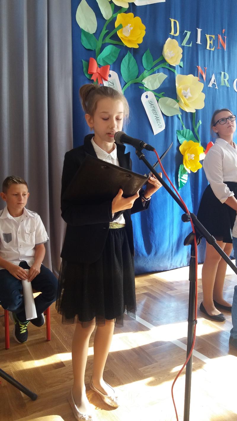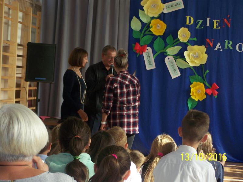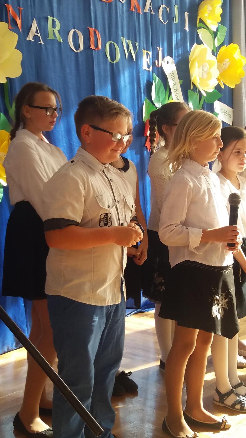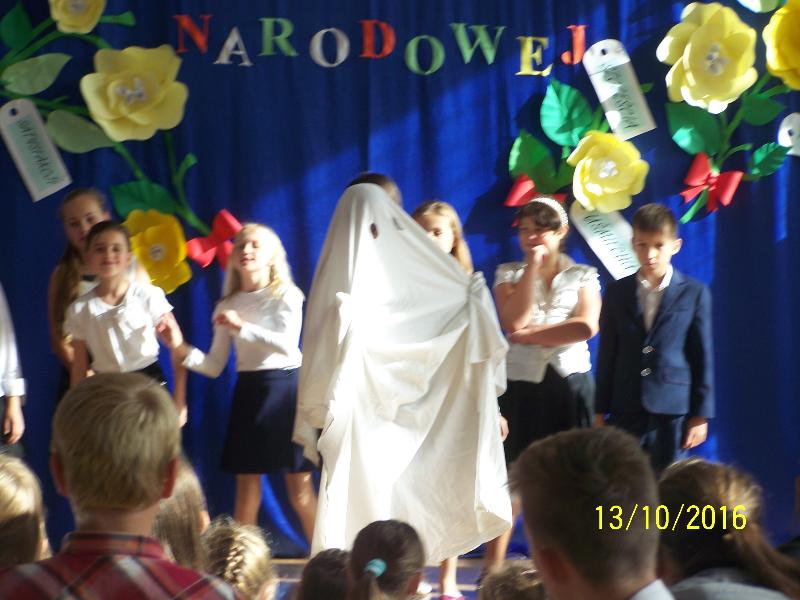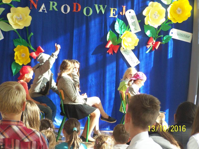 Niezwykle ważnym i oczekiwanym przez zebranych w sali gimnastycznej uczniów, pracowników szkoły, emerytów oraz rodziców był występ uczniów klasy IVA, którzy pod kierunkiem p. Katarzyny Marczak przygotowali część rozrywkową akademii. Piękne dekoracje były dziełem Pań: Katarzyny Malińskiej i Adriany Ostas a oprawa muzyczna p. Jacka Zdanowskiego.