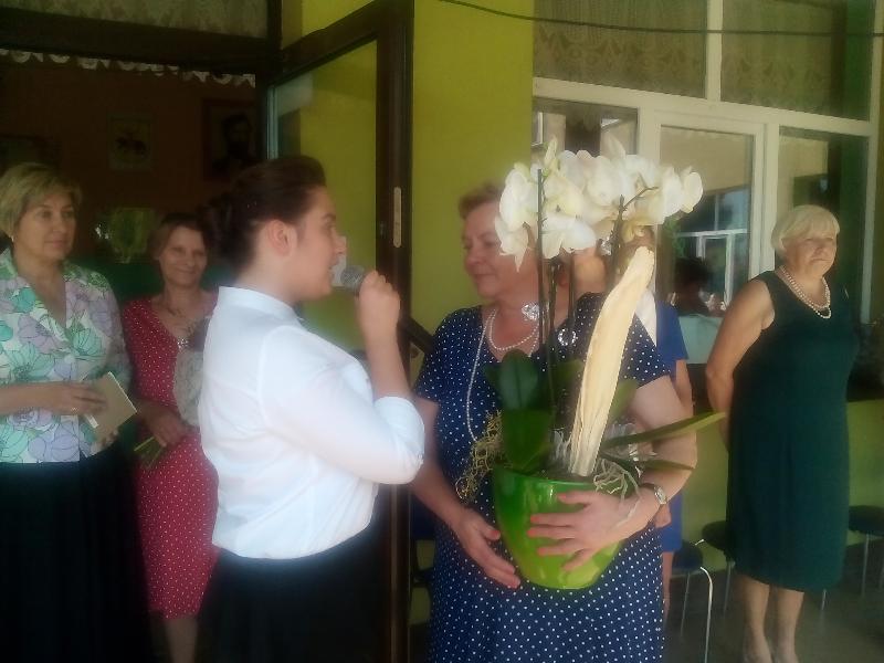 Podczas uroczystego zakończenia roku szkolnego Grono Pedagogiczne, uczniowie i rodzice pożegnali odchodzącą na emeryturę wieloletnią nauczycielkę języka polskiego - Panią mgr Danutę Borowską. W imieniu społeczności szkolnej pożegnała nauczycielkę pani dyrektor szkoły Teresa Kozos.